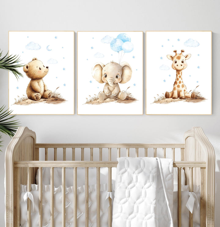 Boy Nursery Wall Art Set of 3 | Baby Bear, Elephant, Giraffe Prints | Blue Safari Animal Artwork | Woodland Jungle Baby Room Decor