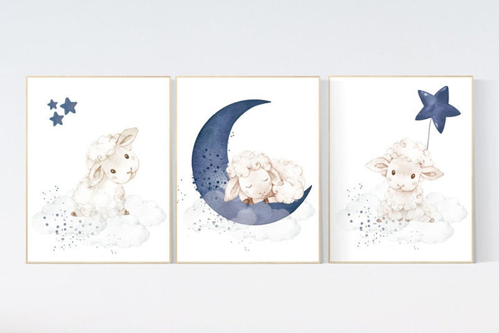 Lamb Nursery Wall Art Set, Moon and Stars Baby Room Decor, Sleepy Sheep Prints, Blue Night Sky Theme, Baby Boy Bedroom Wall Posters