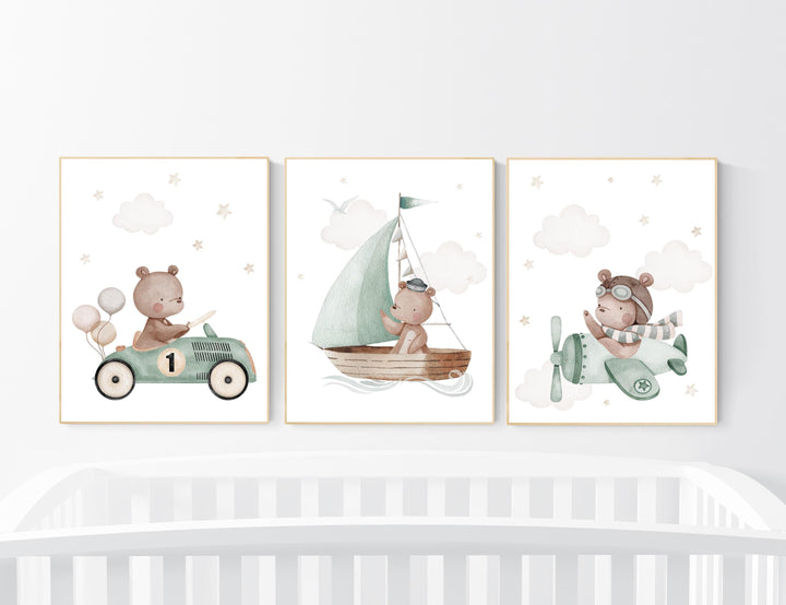 Nursery decor bear, gender neutral nursery, travel nursery, plane nursery, car nursery, bear nursery print, teddy bear decor, sage green