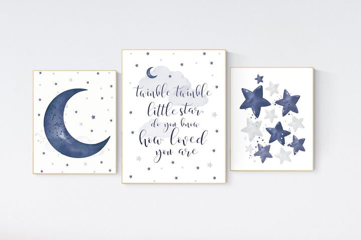 Nursery decor boy, navy nursery decor, moon and stars, twinkle twinkle little star, navy blue nursery art, baby boy nursery art, navy blue