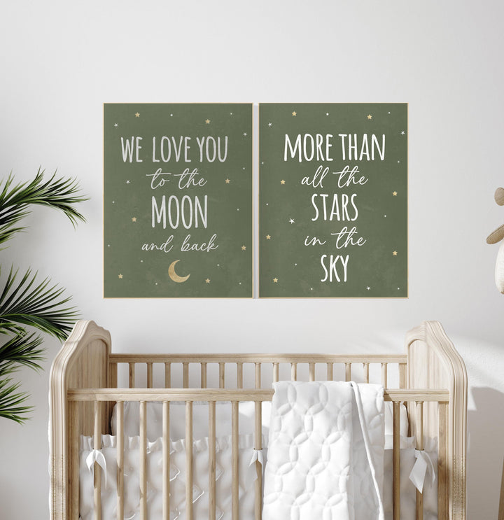 Nursery decor sage gold, we love you to the moon and back, Nursery wall art, green nursery decor, moon and stars, nursery prints