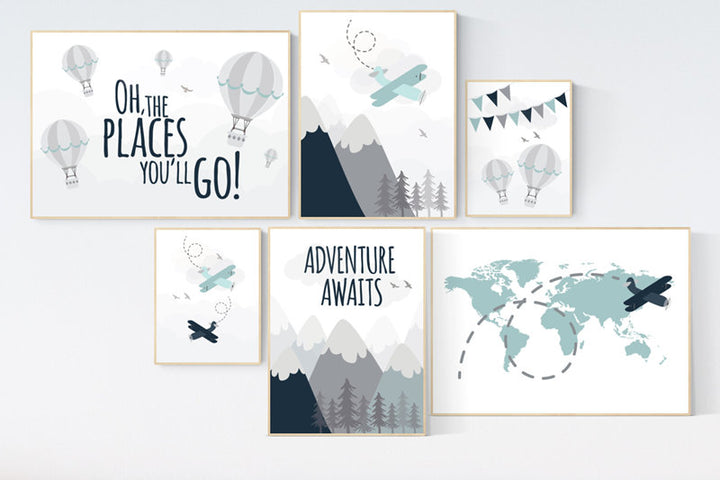 Nursery decor boy mountains adventure, mountain nursery art, adventure awaits. mountain, hot air balloon, planes, world map, gender neutral