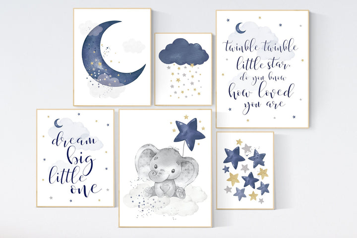 Nursery decor boy elephant, nursery wall art boy, navy Blue gold, moon and stars, navy nursery, boy nursery decor, elephant nursery art