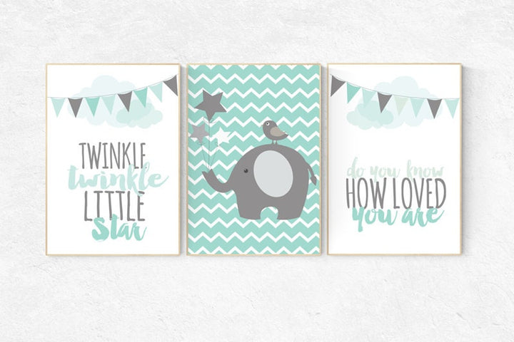 Twinkle Twinkle Little Star, mint nursery decor, mint gray, gender neutral, nursery decor elephant, nursery decor boy teal, mint grey