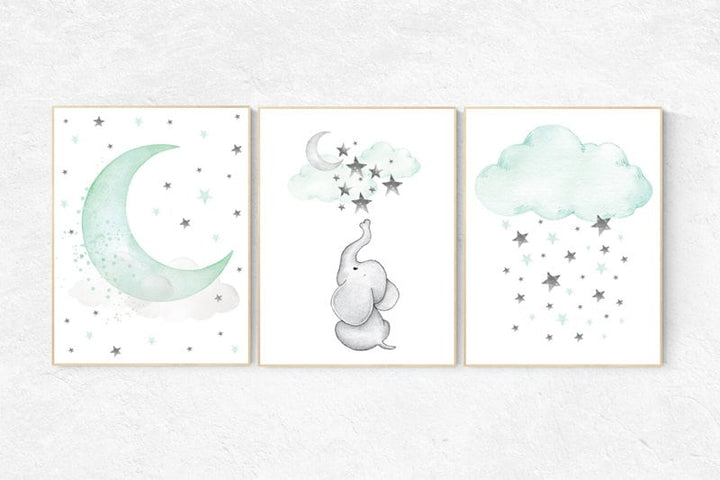 Nursery decor elephant, Mint nursery decor, dream big little one, gender neutral nursery, cloud and star nursery, elephant nursery prints