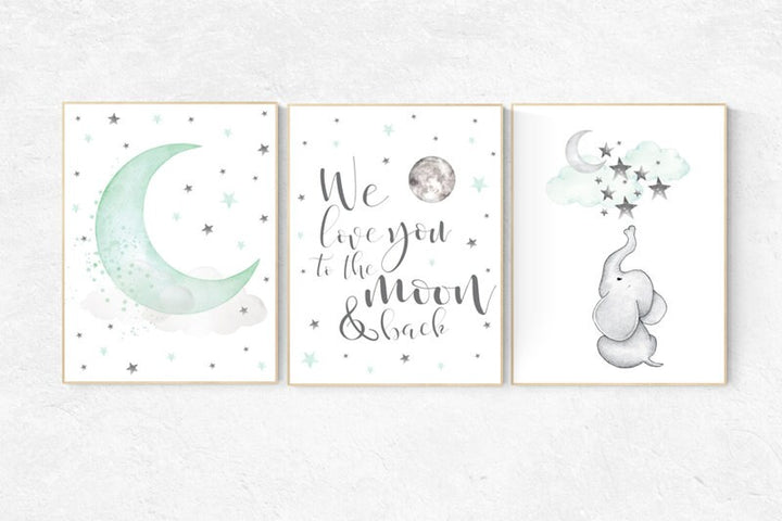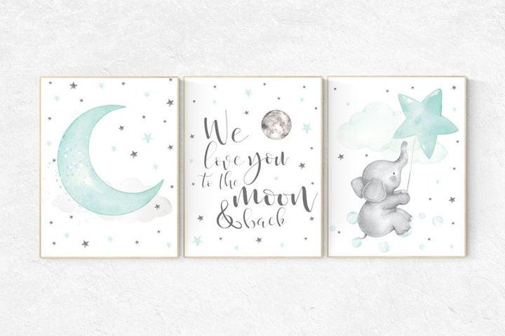 Nursery decor elephant, we love you to the moon and back, Mint nursery decor, nursery decor neutral, nursery decor boy teal, cloud and star