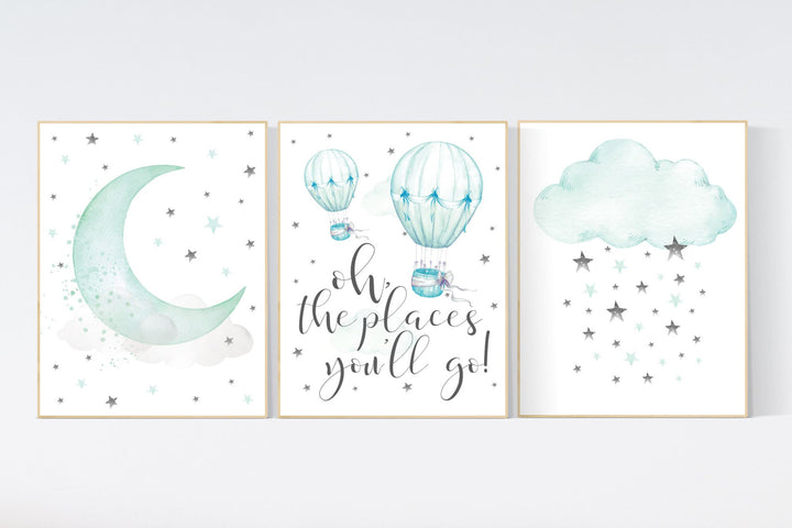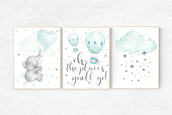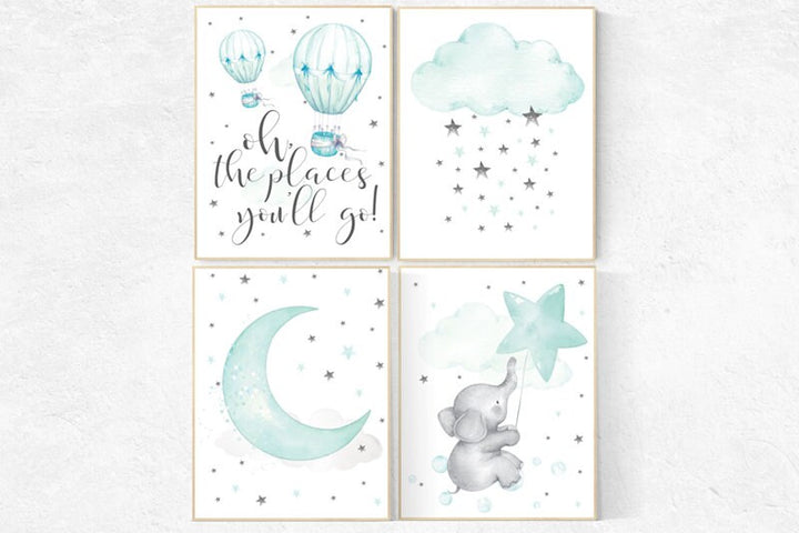 Mint nursery decor, hot air balloon, elephant, gender neutral nursery, oh the places you'll go, mint green nursery wall art, cloud and stars
