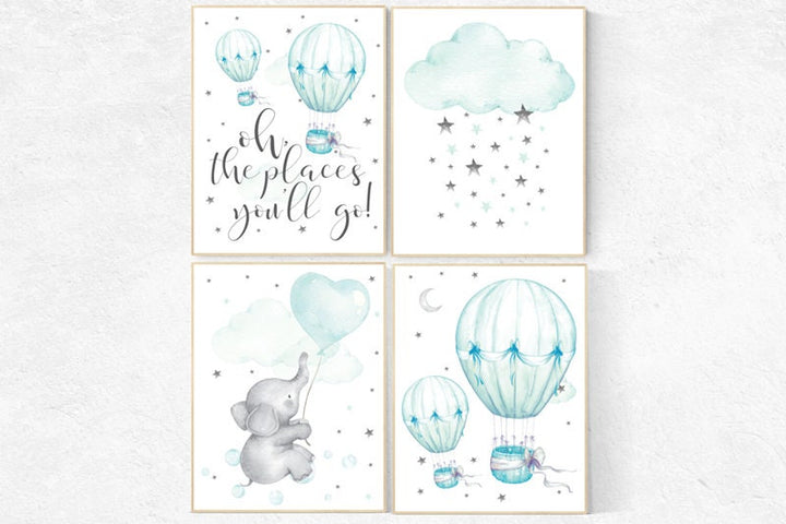 Mint nursery decor, nursery decor elephant, hot air balloon, gender neutral nursery, oh the places you'll go, mint green nursery wall art