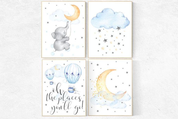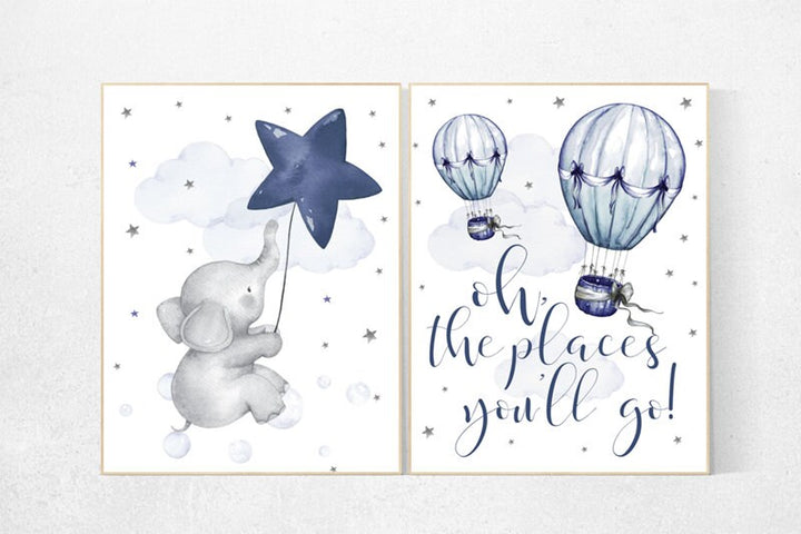 Nursery decor boy elephant, oh the places you'll go, navy nursery decor, cloud and stars, hot air balloon, navy blue nursery art. baby room