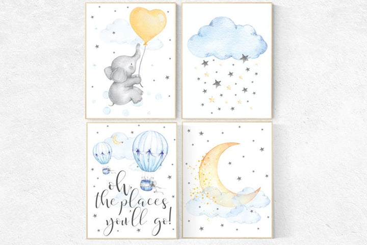 Nursery wall art elephant, hot air balloon, oh the places you'll go, Nursery decor neutral, gender neutral, cloud and stars, baby room decor