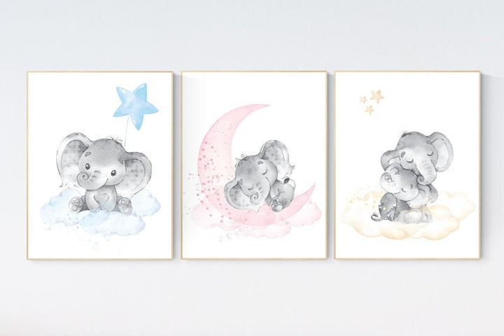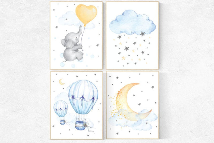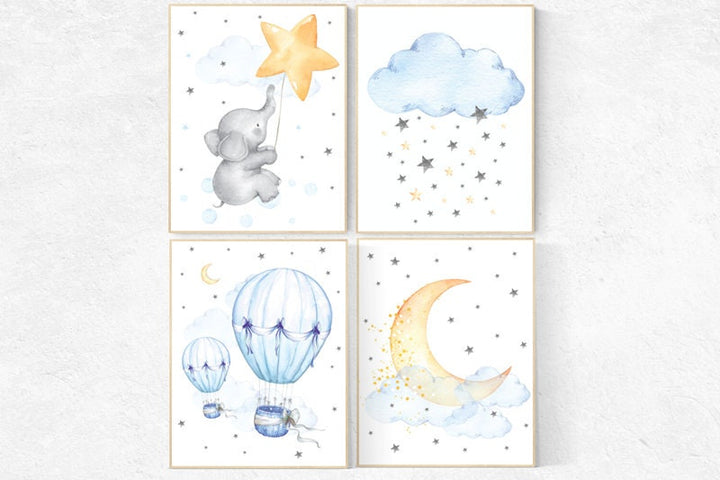 Nursery wall art elephant, nursery decor hot air balloons, cloud nursery decor, Nursery decor neutral, moon and stars nursery gender neutral