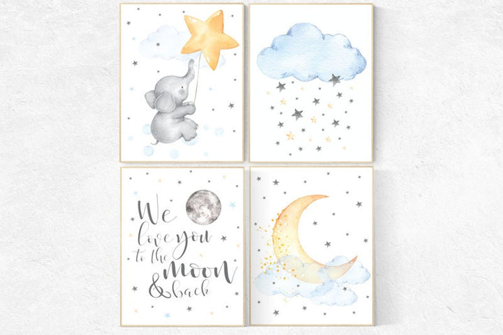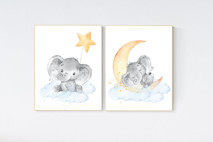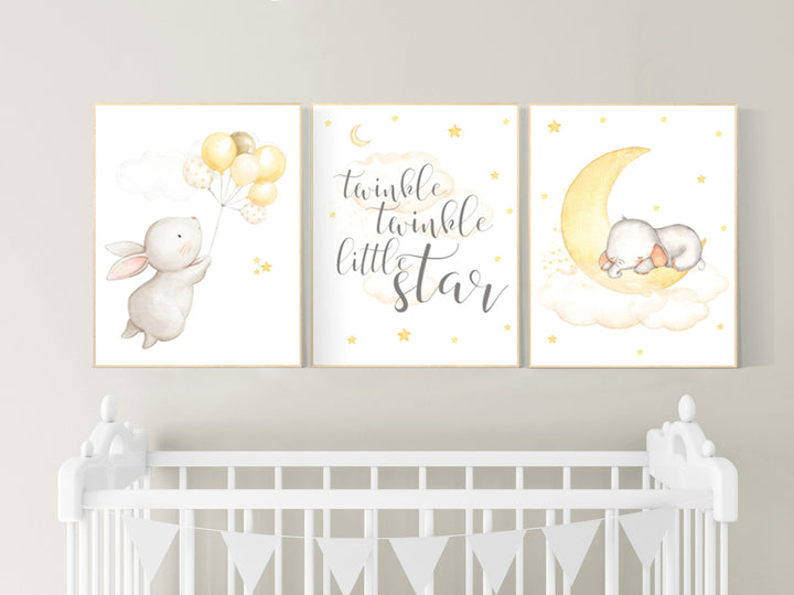 Gender neutral nursery wall art, yellow gray, yellow grey, elephant nursery, bunny nursery, stars and moon, baby room wall decor, twinkle