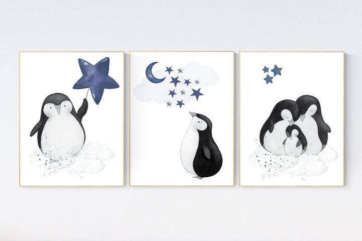 Navy nursery decor, penguin nursery, cloud and stars, navy blue nursery art. baby room wall art, boy nursery decor, nursery wall art penguin