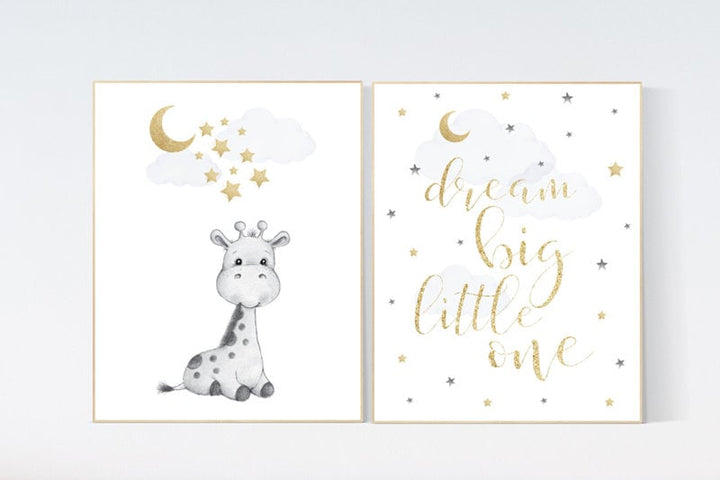 Nursery decor giraffe, gold nursery decor, cloud and stars, moon and stars, dream big little one, baby room wall art, giraffe nursery