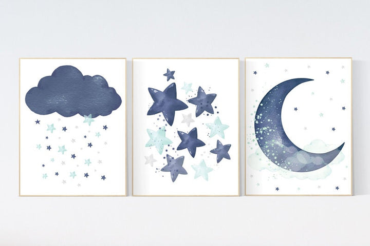 Navy mint nursery decor, cloud and stars, moon and stars, navy and mint nursery art. baby room wall art, boy nursery decor, set of 3