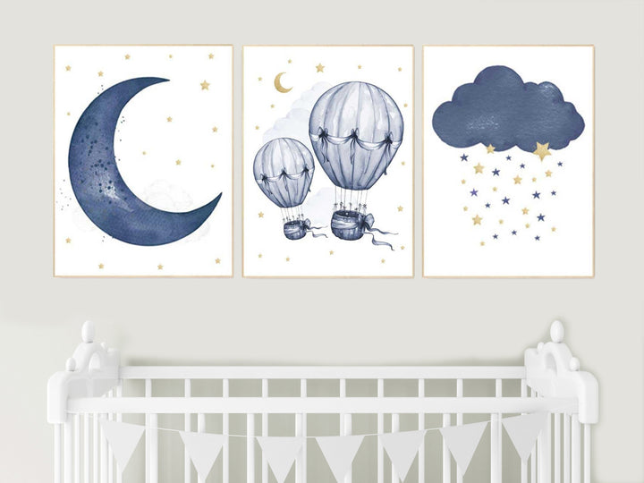 Nursery decor boy, Navy gold, cloud moon and stars nursery, hot air balloon, baby boy nursery idea, boy nursery art, navy and gold, prints