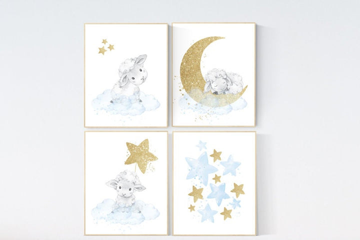 Sheep nursery decor, nursery decor boy, blue and gold, blue gold nursery decor, nursery decor lambs, nursery wall art sheep, moon and cloud
