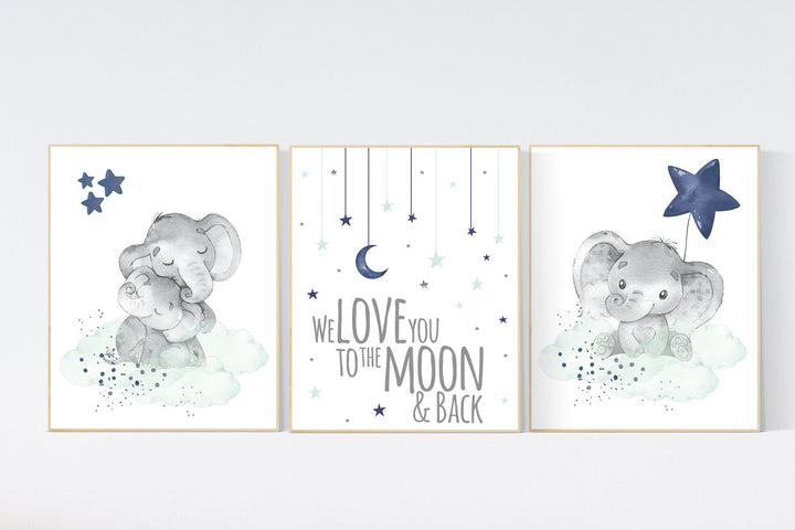 Elephant nursery, Navy and mint nursery decor, navy mint nursery art, baby room wall art, we love you to the moon and back, nursery prints