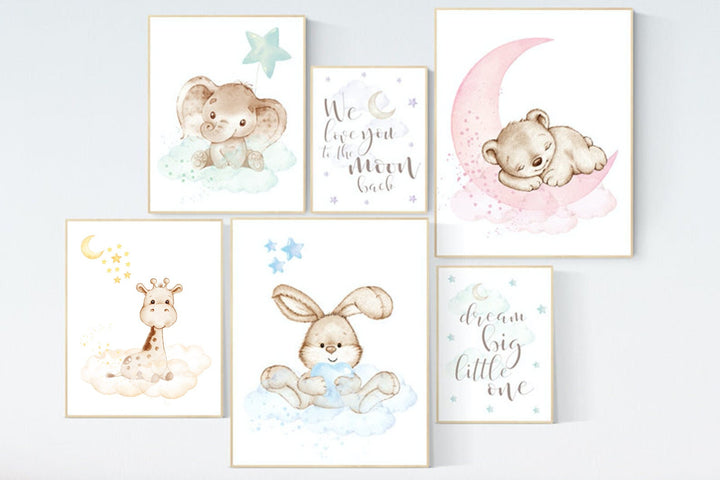 Nursery decor gender neutral, Nursery wall art animals, pastel colors, neutral, bunny, bear, elephant, giraffe, quote nursery wall decor