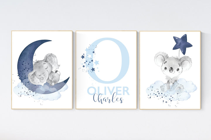 Nursery decor boy, navy blue nursery, elephant, koala, nursery wall art boy, nursery prints boy, set of 3, navy nursery, name nursery