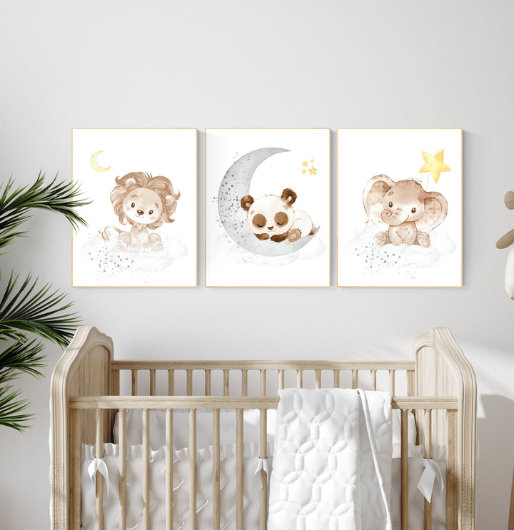 Nursery decor neutral, Yellow gray nursery, nursery wall art animals, elephant, lion, panda, moon, stars, gender neutral, yellow and gray