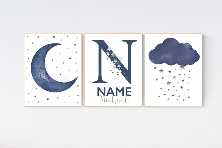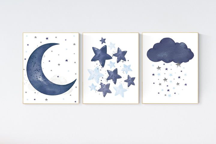 Navy nursery decor, cloud and stars, moon and stars, navy blue nursery art. baby room wall art, boy nursery decor, set of 3, nursery art