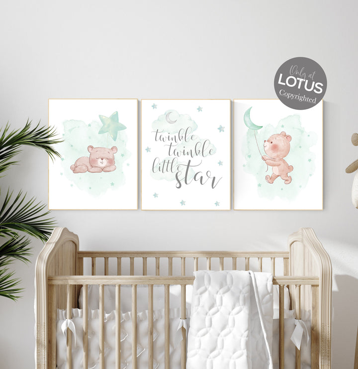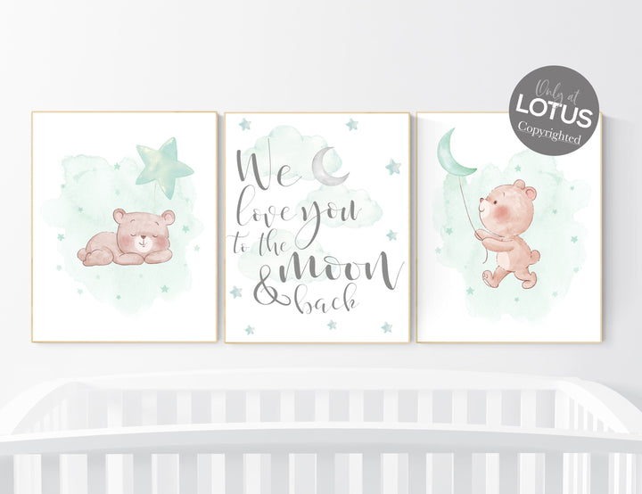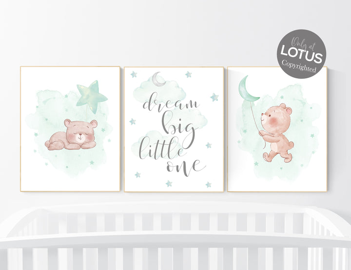 Gender neutral nursery, nursery decor bear, Mint nursery decor, , gender neutral nursery, moon and clouds, mint green nursery wall art