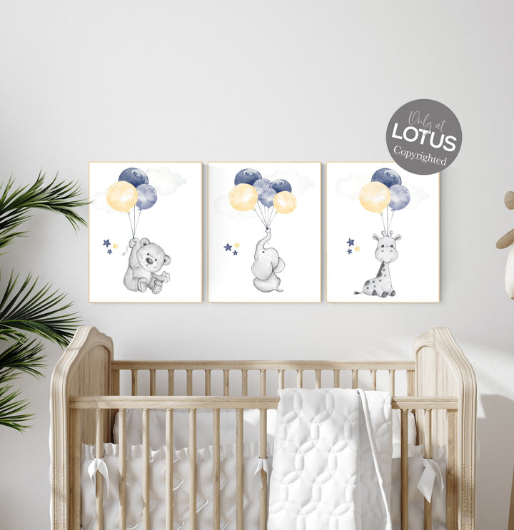 Animal nursery wall art, nursery decor Navy yellow, giraffe, elephant, bear, navy and yellow, gender neutral nursery, animal prints