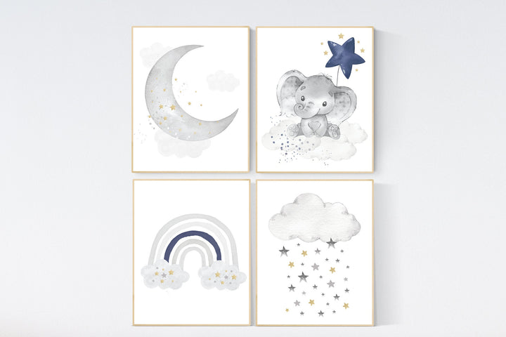 Navy nursery decor, cloud and stars, rainbow nursery, moon and stars, navy blue, gold nursery art, baby room wall art, boy nursery decor