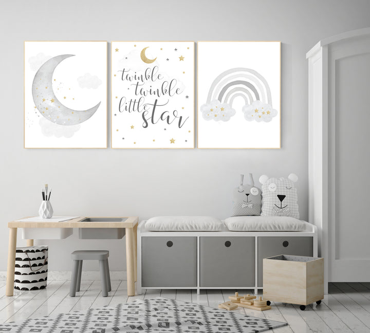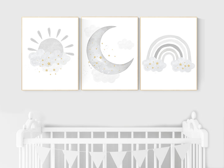 Nursery wall art grey, gray gold nursery, rainbow nursery decor, baby room decor gender neutral, moon and stars, baby room wall art,