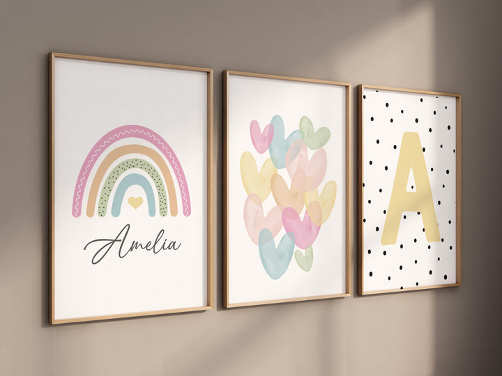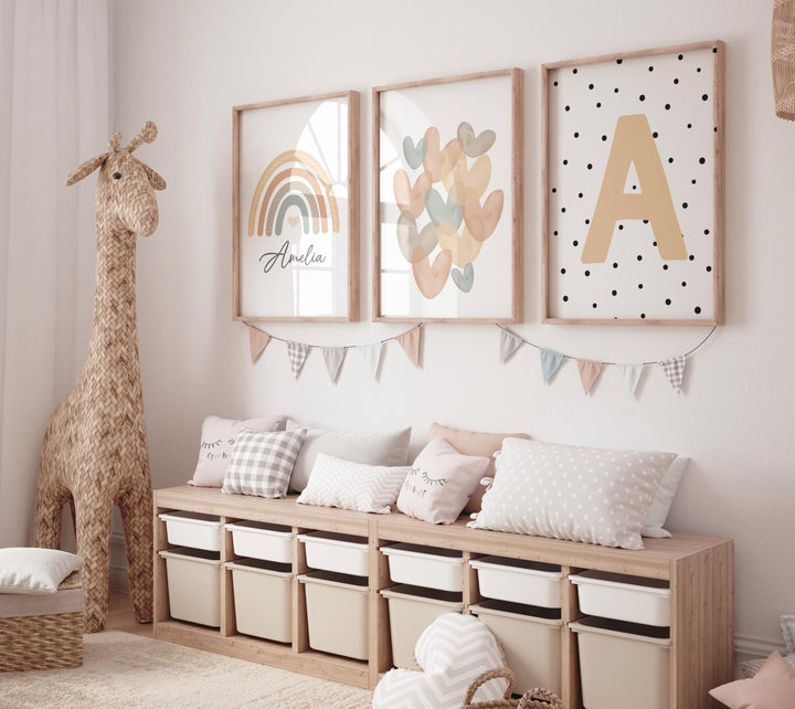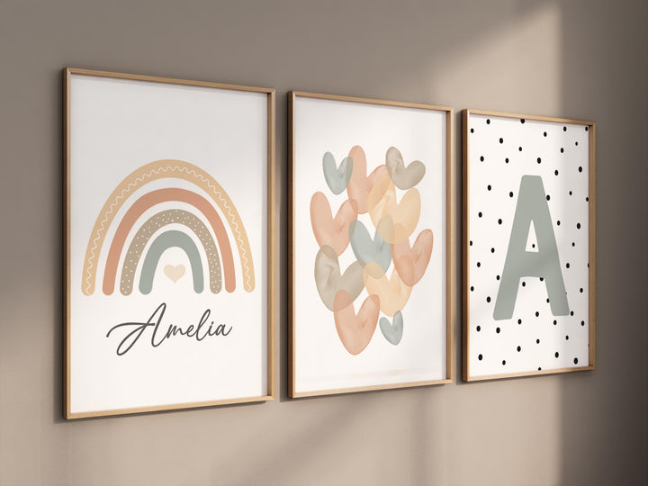 Custom rainbow nursery prints, Boho personalized wall art for kids, Earth-tone nursery decor, heart print, monogram set, Neutral rainbow