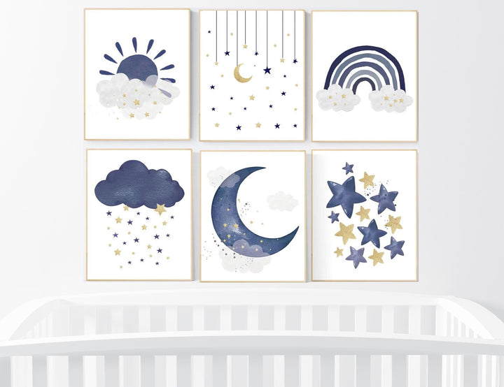 Navy nursery decor, boy nursery wall decor, rainbow nursery, cloud and stars, moon and stars, navy blue, gold nursery, nursery prints boy