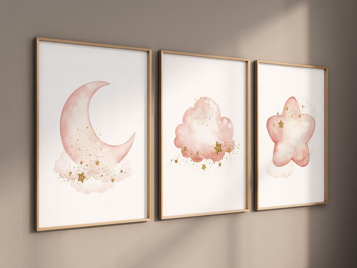 Blush moon and stars nursery art, Moon, cloud, and star prints for baby room, Nursery prints rainbow, pink and gold nursery artwork