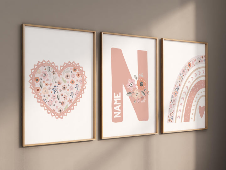 Personalized floral name nursery prints, heart and rainbow wall art for girls, Blush pink boho nursery decor, Custom name initial print