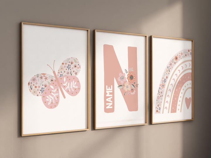 Personalized floral name nursery prints, Butterfly and rainbow wall art for girls, Blush pink boho nursery decor, Custom name initial print