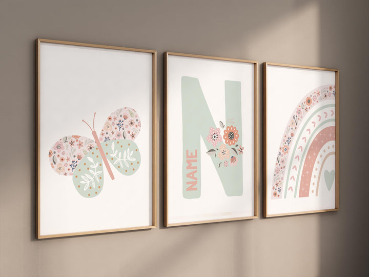 Personalized floral name nursery prints, Butterfly and rainbow wall art for girls, pink mint, boho nursery decor, Custom name initial print
