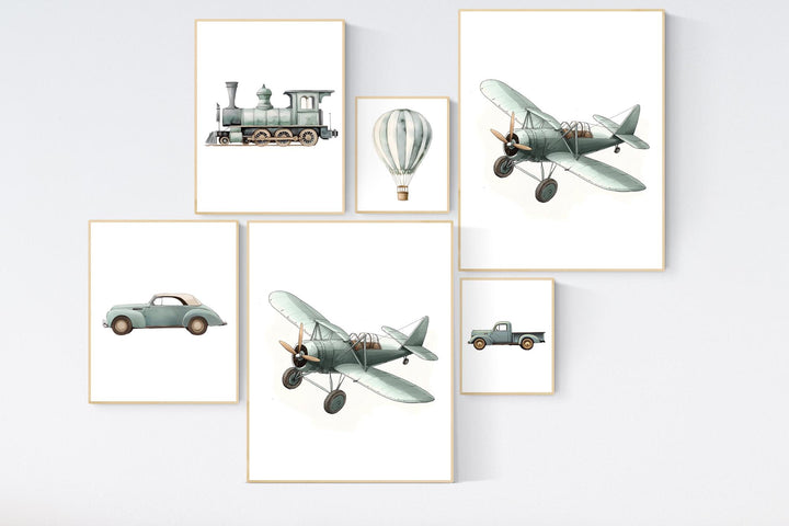 Vehicle art print set, sage green, Boys room, car train plane boat hot air balloon, boys transportation print, boys nursery room decor