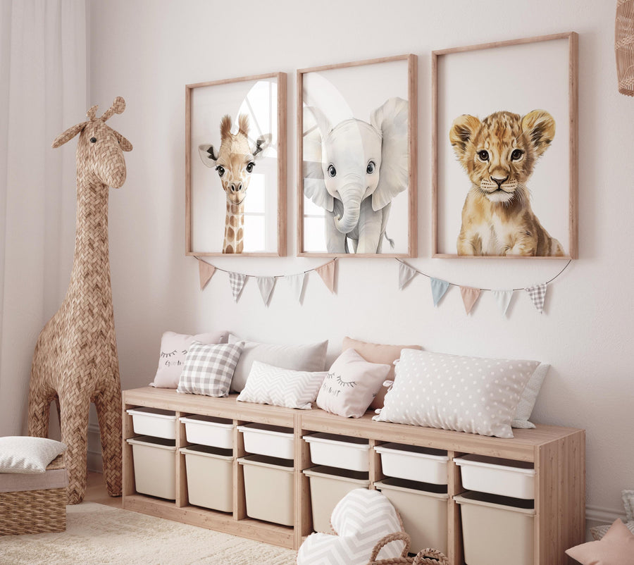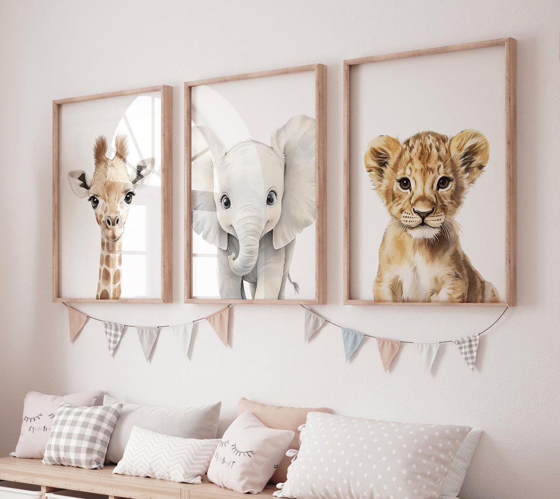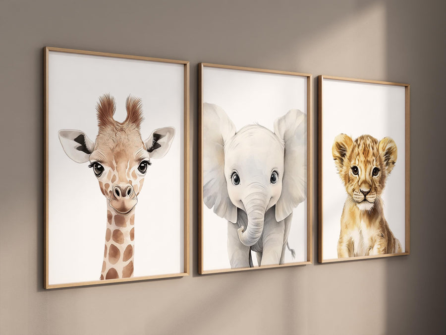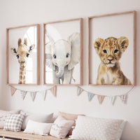 Create a heartwarming safari adventure in your baby's room with this realistic animal wall art set, featuring a baby giraffe, elephant, and lion cub in soft watercolor detail. Perfect for jungle, safari, or gender-neutral nursery themes, these prints add a sweet, lifelike charm to any nursery or toddler space.